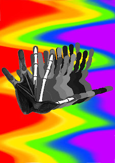 Using a variation of art techniques such as the use of different media and a visual manipulation of certain features of the human body the idea of sexual freedom can be grasped. Generally, a hand is a key feature in defining the gender of a person. A general stereotype is men have rougher and fuller hands while feminine hands are more delicate hands. This series suggests that underneath the skin every person internally looks almost identical. Exploring that gender freedom is an acceptable concept as people shouldn't be defined by their external features. Furthermore, the continued reference to the rainbow symbol throughout the series emphasises the push for gender equality and acceptance.